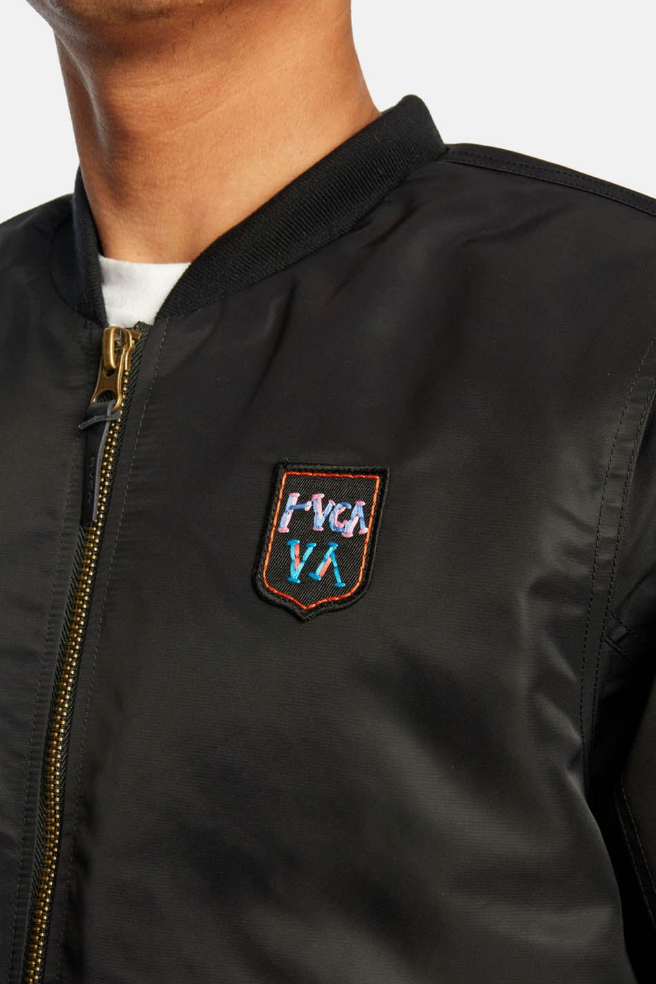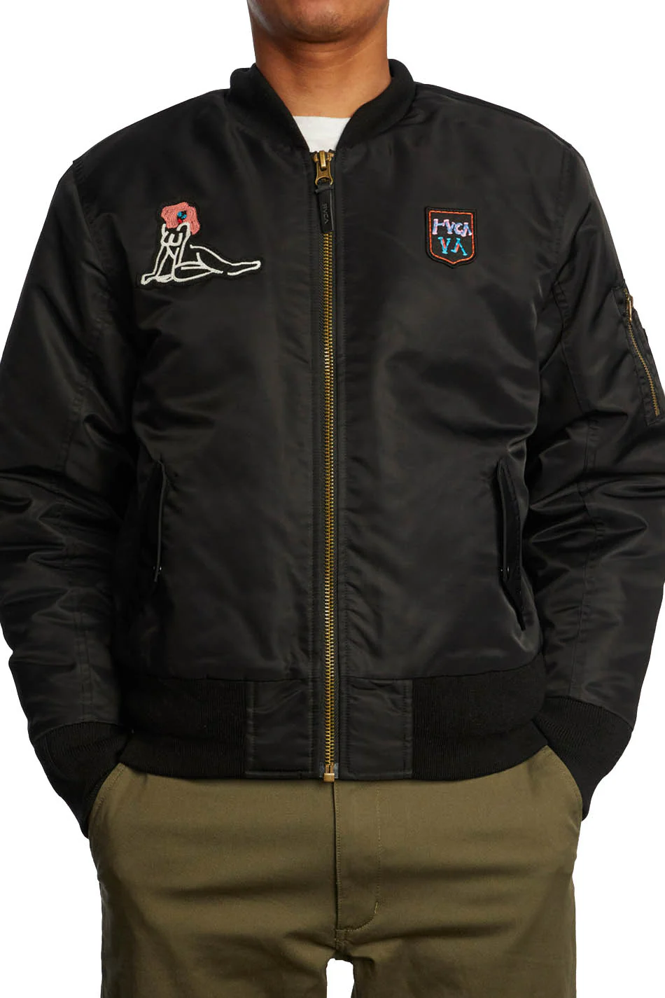 Transformez votre look pour le froid avec la veste d’aviateur Rvca Oblow customisée avec des patchs de l’artiste ANP Mark Oblow.