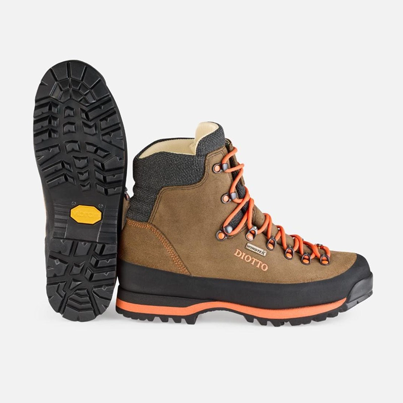 Chaussures de chasse et de trekking en cuir pleine fleur retourné, avec une tige composée d’une seule pièce à pli unique superposé (brevet Diotto®), permettant à l’eau et aux débris forestiers de s’écouler afin d’éviter toute stagnation interne.