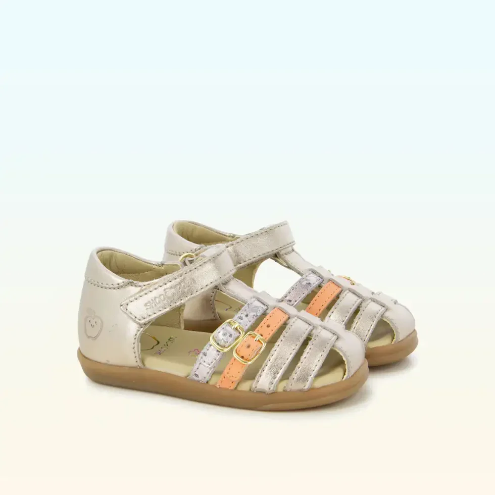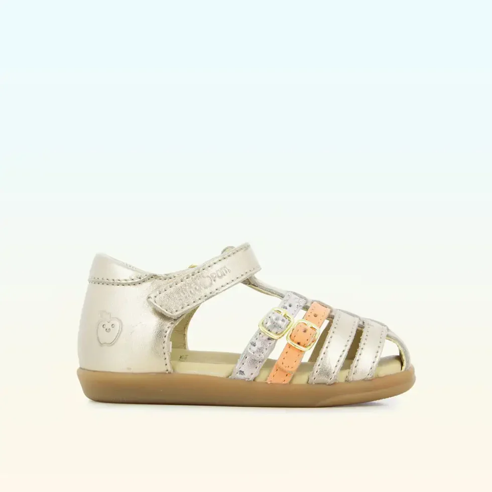 Cette sandale premiers-pas pour enfants est présentée dans une version en cuir métallisé doré, avec des brides multi couleurs. Cette chaussure souple et légère est conçue avec des matériaux de qualité pour le bon développement du pied et l’apprentissage de la marche. Elle se chausse et se déchausse facilement grâce à son scratch. Son bout fermé protège les orteils.