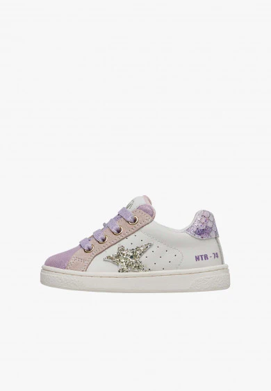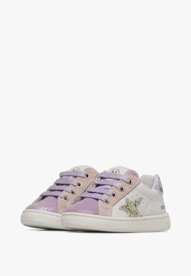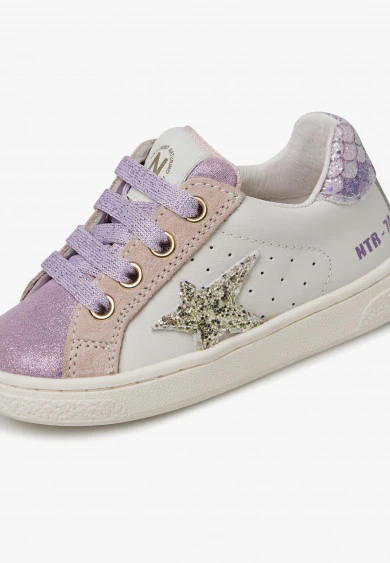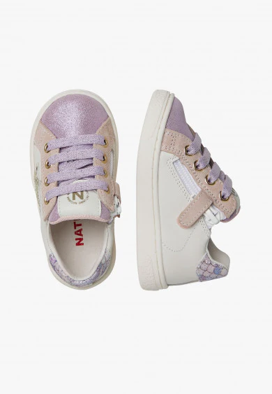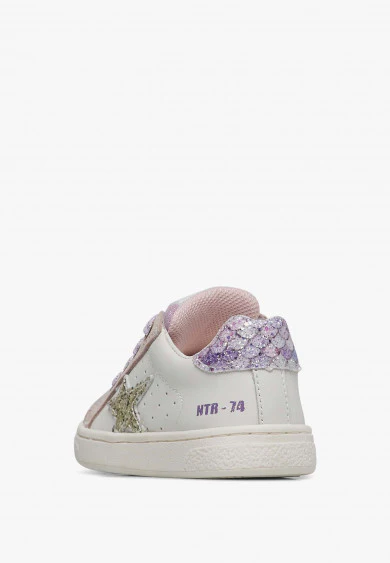 Basket avec tige en veau souple, perforations latérales, détails en daim pailleté et étoile latérale en cuir finition pailletée. Le renfort est orné d’un imprimé mermaid multicolore. Fermeture à lacets en lurex et zip intérieur, doublure en cuir, semelle en caoutchouc avec motif personnalisé.