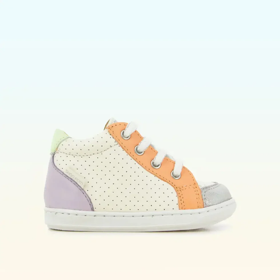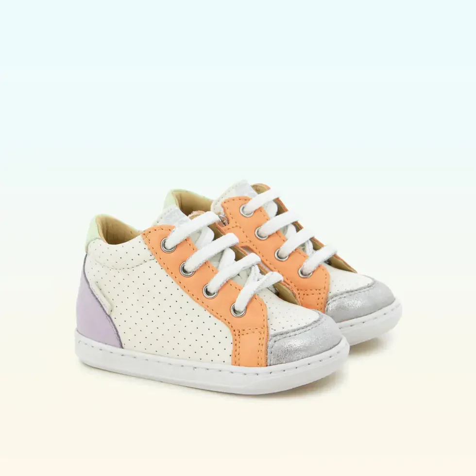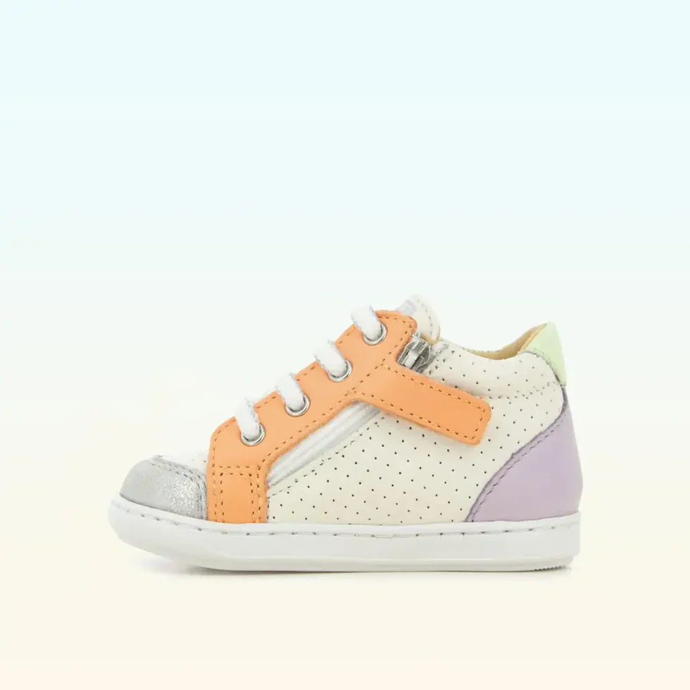 Cette basket premiers-pas à lacets pour enfants est présentée dans une version en cuir lisse à perfo blanc et empiècement orange et violet. Cette chaussure souple et légère est conçue avec des matériaux de qualité pour le bon développement du pied et l’apprentissage de la marche. Sa tige haute avec laçage permet un bon ajustement et maintien de la cheville. Elle se chausse et se déchausse facilement grâce à son zip intérieur.